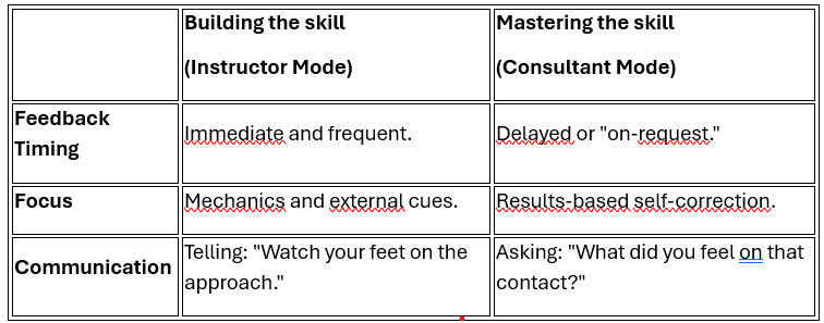 - The consultant mode (for mastering skills). For those players who have a high level of technical proficiency, I’m actually going to step back a little bit, on purpose. If they already know the ‘how,’ my job isn’t to talk in their ear every rep. My job is to let them use their own cues and learn from the observed result of the ball (trajectory). I’ll tell them that if I’m ‘quiet’ while they’re executing a skill, it’s because I’m trusting their brain to self-correct. In a real match, I’m not on the court with them; they need to be their own best coach. When necessary, I’ll still be there to push their decision-making and strategy, but I’m giving them the space to own their game. I’m more of an architect, creating the environment with relevant constraints to force them to adapt their skills, using their own cues.